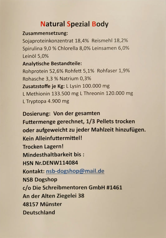 NSB = Natural Special Body ist ein intensiver Zusatz zum täglichen Futter für Ihren Hund, welches die Muskelbildung bei richtiger Anwendung stark fördert.
